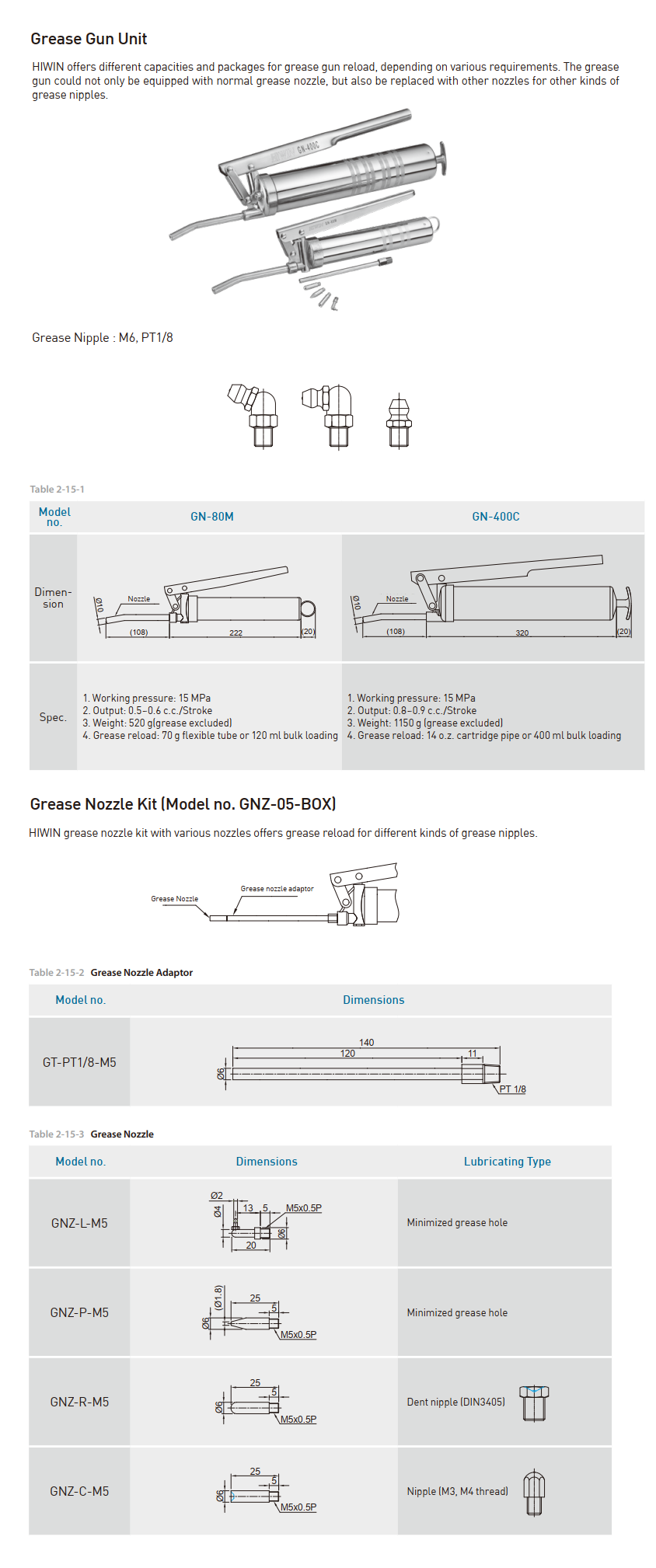 HIWIN cung cấp hai loại dụng cụ bơm mỡ sử dụng cho mỡ bò đóng gói theo 2 dung lượng khác nhau là 70g hoặc 400g. Dụng cụ bơm mỡ của Hiwin được trang bị vòi phun mỡ bình thường, nhưng có thể lắp thêm bộ phụ kiện vòi bơm mỡ của Hiwin để bơm nhiều loại đầu mỡ khác nhau
